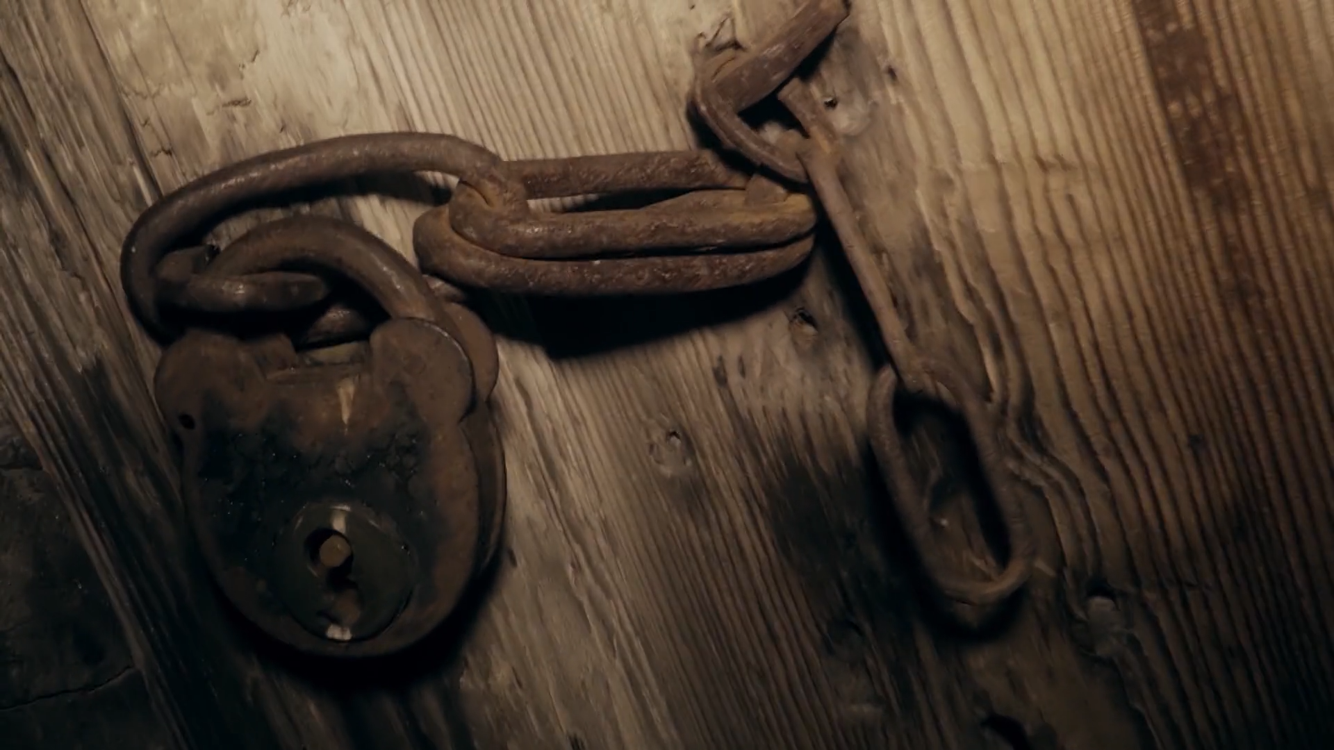A heavy iron padlock and chain recovered from a storage shed believed to have been used to confine one of the victims. Locking mechanism shows signs of repeated use.
